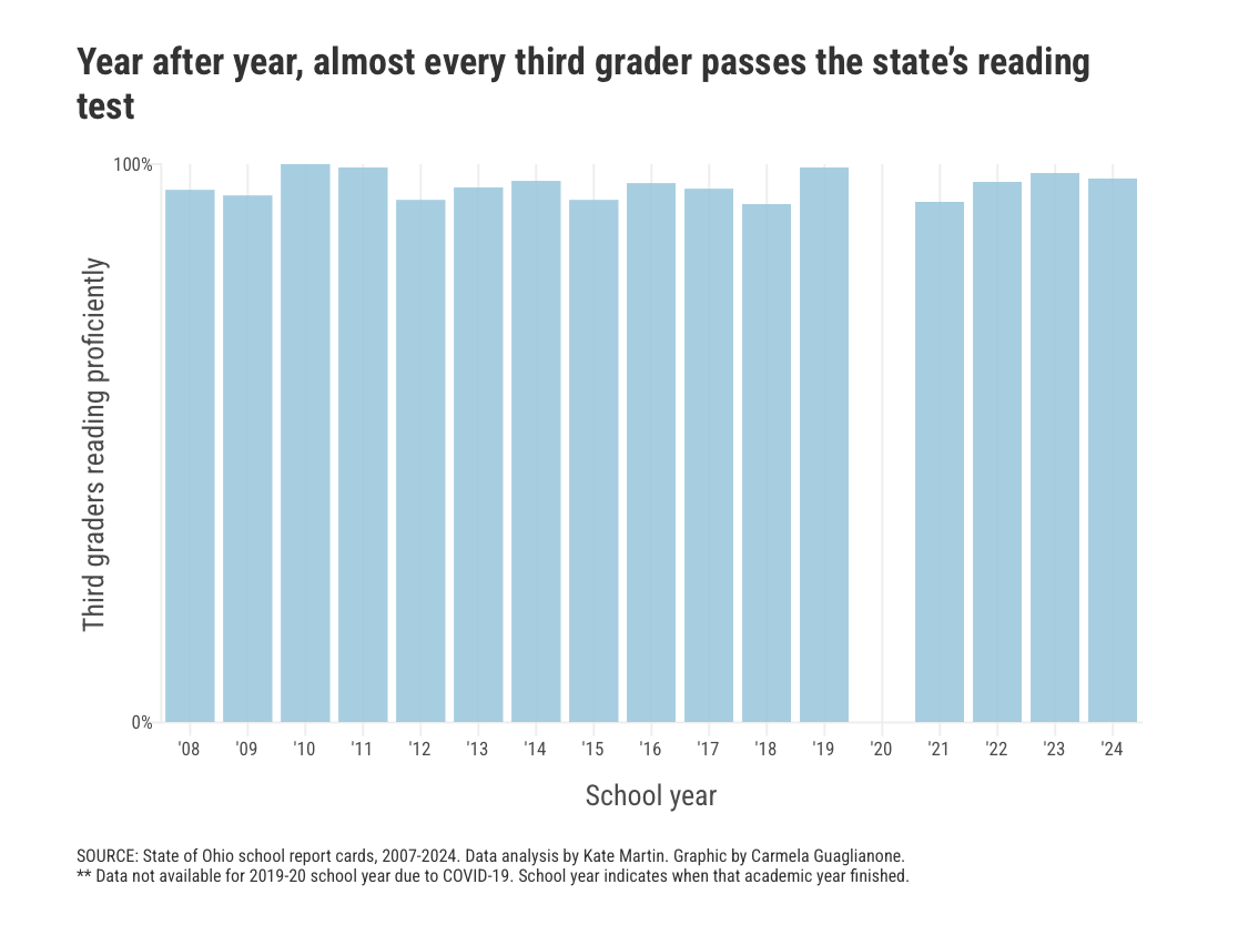 There’s a simple answer (well, sort of) to the question of “how did they do it?” The simple answer is that the district of Steubenville has been effectively implementing a research-based literacy program for over two decades, and that program has led to consistently excellent results, with between 93% - 100% of students in the district passing Ohio’s third grade reading test every single year (even post-COVID!) since 2008.