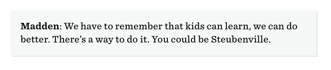 The district in question is Steubenville City Schools, which has also been the subject of Karin Chenoweth’s writing and reporting into that factors that enable some districts to achieve extraordinary student outcomes, particularly when serving student populations that have historically and persistently been marginalized within American schools and society.