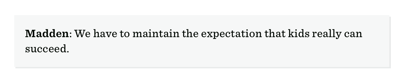 The neat thing about SFA is that it was designed with this ethos in mind. Hanford even quotes Nancy Madden, the education researcher who co-created the program with her husband, education researcher Robert Slavin, noting that the premise of the program was built upon the foundational belief that students will rise to the expectations we set for them . . .
