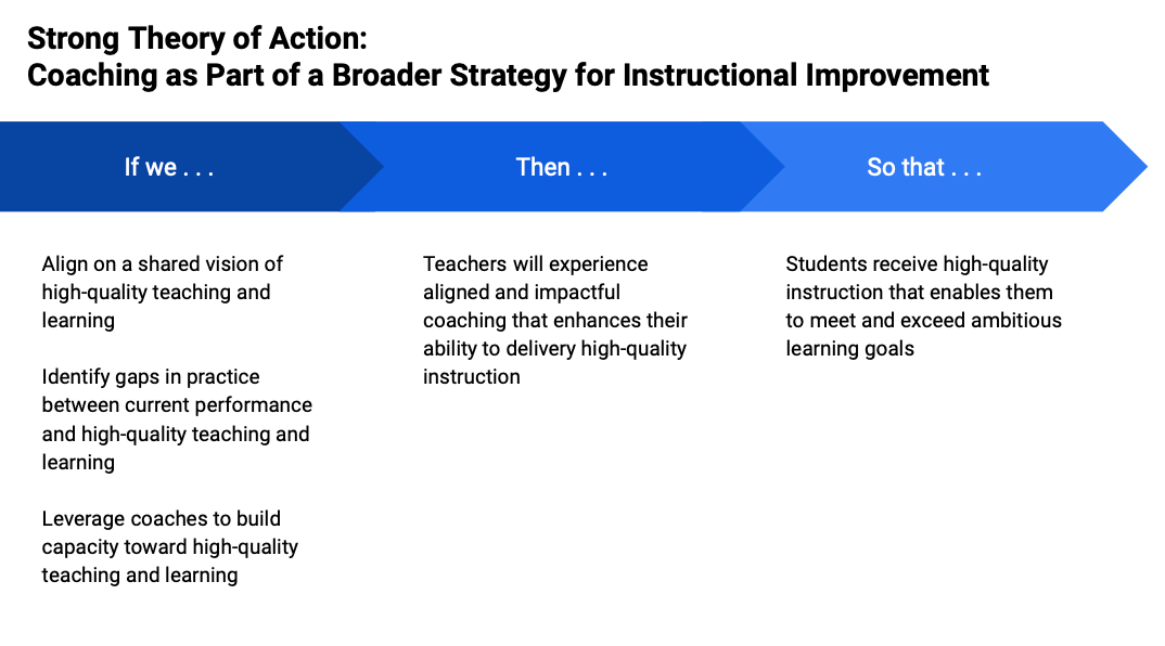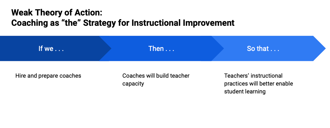 This advice echoes that of Woulfin, Stevenson, and Lord (2023) in Making Coaching Matter: Leading Continuous Improvement in Schools, who note that too often coaching gets positioned as the strategy as opposed to an element of the broader strategy for enacting instructional improvement. As the authors write, “coaching exists not as an end in itself but in service of a larger vision.” Unless coaches themselves (as well as both principals supervising coaches and teachers receiving coaching) know what coaches are coaching towards, coaching is unlikely to lead to the payoff that district leaders might hope for.